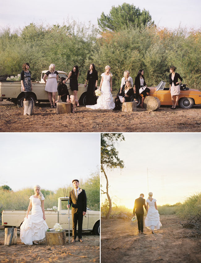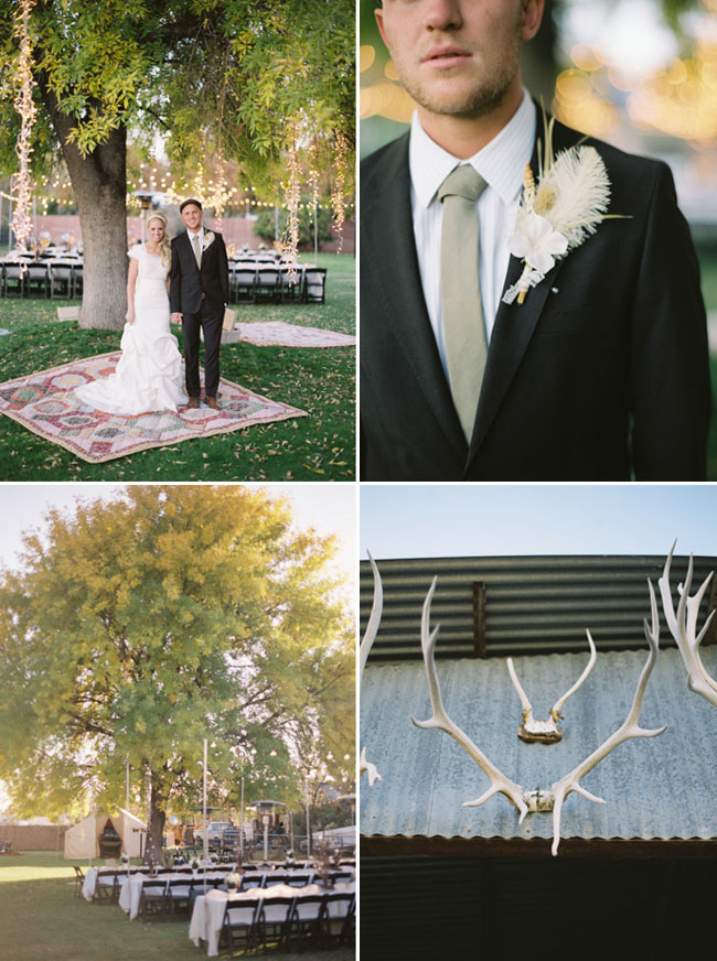 This is actually the wedding that inspired me to do this post. Not only is this couple frickin' adorable, they created a great backyard wedding that I totally envy. I love the decor - subtle natural elements and a bit of sparkle here and there - and the feel of the whole day - rustic and vintage with a touch of whimsy and a whole lot of fun. The bridal party was decked out in all mismatched black and white, allowing each girl or guy's personality to come through a bit. Their cake was placed atop an old record player, complete with vinyl albums on the shelf below. Everything about this wedding is classy and romantic but still personal, a bit casual, and completely one-of-a-kind.